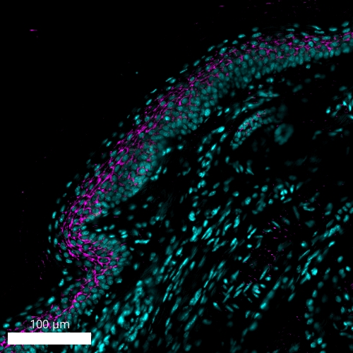 | Mouse whole foot Fixed Frozen: E-cadherin (magenta, catalog number 699308) and DAPI (cyan, MBD0015) |